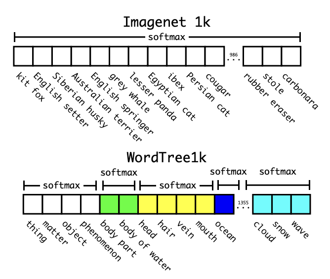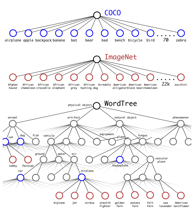 - WordTree: YOLO9000은 WordTree라는 계층 구조를 활용하여 각 클래스 간의 관계를 정의하고, 클래스별 확률을 조정하여 모델이 더 많은 클래스에서 효과적으로 학습할 수 있도록 한다. 이를 통해 새로운 데이터셋과 클래스에도 쉽게 확장될 수 있으며, 다양한 애플리케이션에서 사용될 수 있는 강력한 유연성을 제공한다.