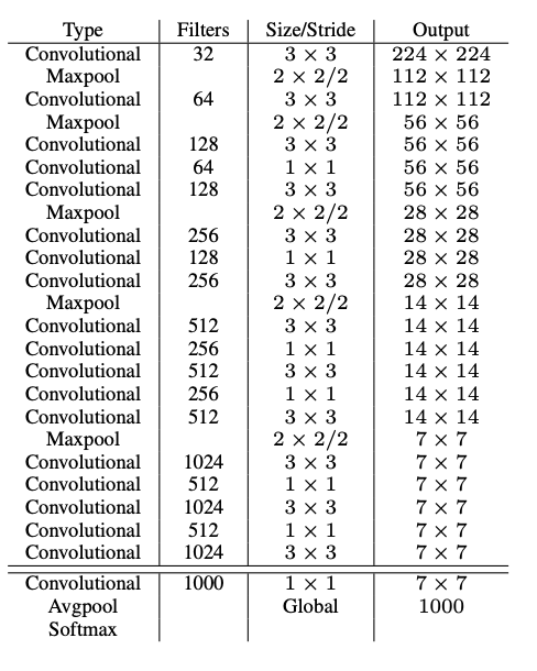 - Darknet-19: YOLOv2는 새로운 백본 네트워크로 Darknet-19를 도입했는데, 이 네트워크는 19개의 컨볼루션 레이어와 5개의 맥스풀링 레이어로 구성되어 있으며, 경량화된 구조로 인해 연산 속도가 매우 빠르다. Darknet-19는 이미지넷(ImageNet) 데이터셋에서 분류 정확도를 높게 유지하면서도, YOLOv1에서 사용된 모델보다 훨씬 빠른 속도를 보여준다.