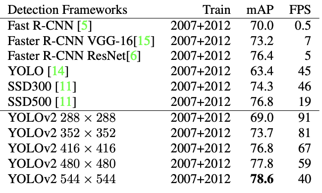 - Multi-Scale Training: YOLOv2는 학습 중에 다양한 해상도의 이미지를 사용하여 모델이 다양한 크기와 스케일에 적응할 수 있도록 훈련되었다. 이는 모델이 더 작은 해상도에서도 빠르게 동작할 수 있게 하며, 동시에 높은 해상도에서의 정확도를 유지할 수 있게 한다. 이 접근법은 다양한 해상도의 입력 이미지에서 균형 잡힌 성능을 제공하는 데 기여했다.