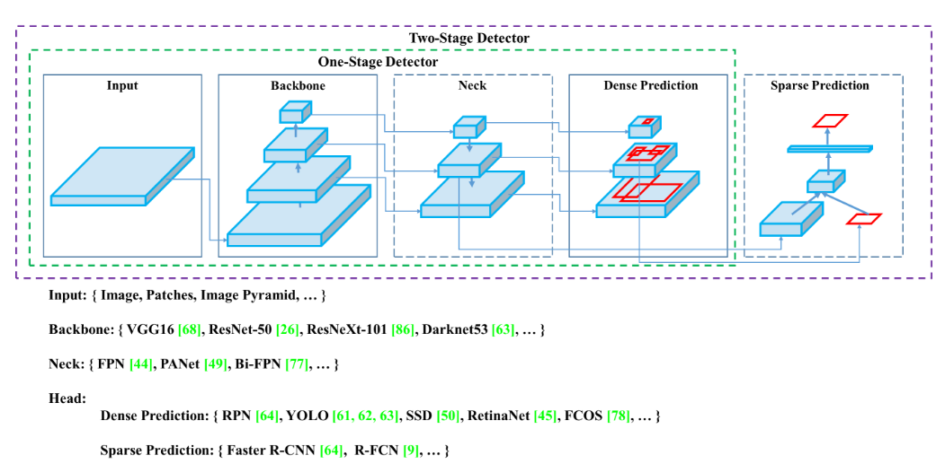 - 이 외에도 Backbone과 Head사이에 Neck을 추가해 다양한 Feature Map을 collect하는 구조도 존재하며, FPN, PAN, BiFPN등이 이에 해당한다. 이를 통해서 Object Detection의 성능을 더욱 향상 시킬 수 있다.