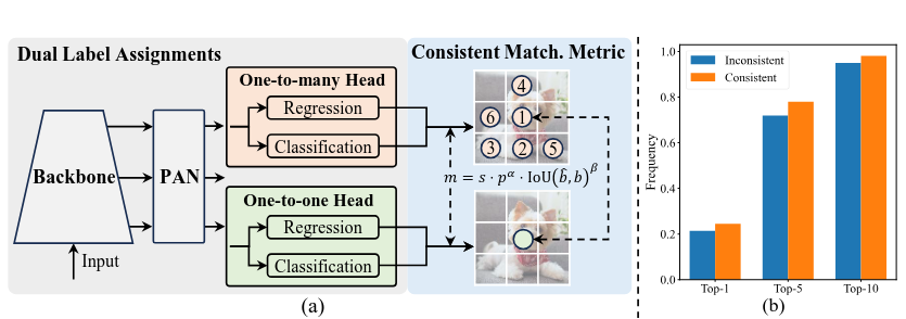 YOLO 모델에서는 객체를 예측하고, 이 예측이 ground truth와 얼만 잘 맞는지 평가하는 방법(matching metric)이 필요하다. 이 방법은 훈련 과정에서 모델이 더 잘 학습 할 수 있도록 해준다. 하지만, 기존의 YOLO 모델은 여러개의 예측을 하나의 객체에 연결(1매칭)해서 학습하는데, 이는 정확도를 높여주지만, 최종 결과를 얻기 위해 불필요한 prediction을 제거하는 과정(NMS)이 필요하다. 이러한 과정이 모델의 latency에 좋지 않은 영향을 준다.