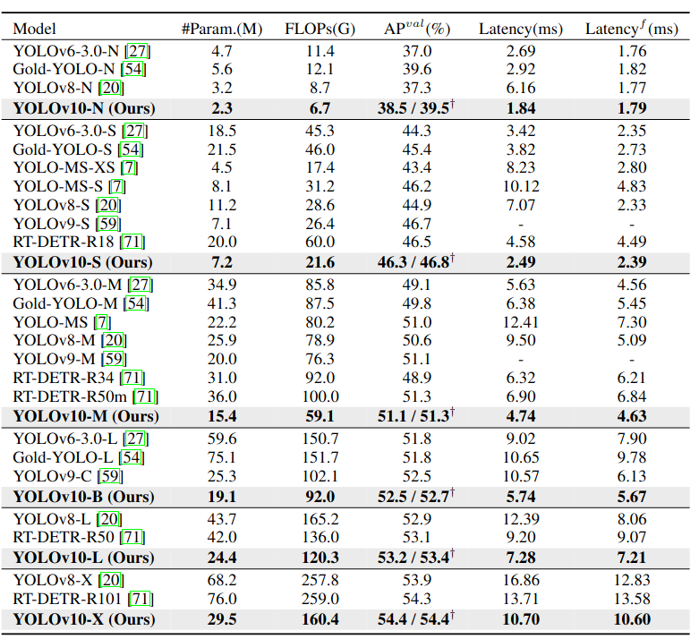 - YOLOv10-S에서 이 접근법은 end-to-end latency를 4.63ms로 줄이면서, 44.3% AP로 경쟁력 있는 성능을 유지함