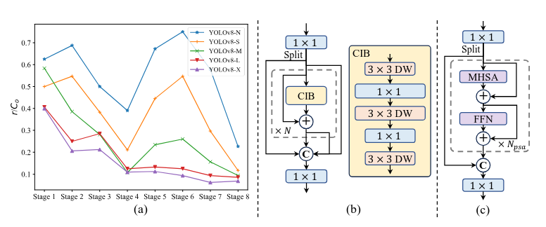 - Rank-guided block design: YOLO는 모든 단계에서 동일한 기본 블록을 사용하는데, 이로 인해 일부 단계에서 불필요한 계산이 발생할 수 있다. 각 단계의 중요도를 분석한 후, 복잡도가 높은 단계를 간소화된 블록으로 대체하여 효율성을 높였다.